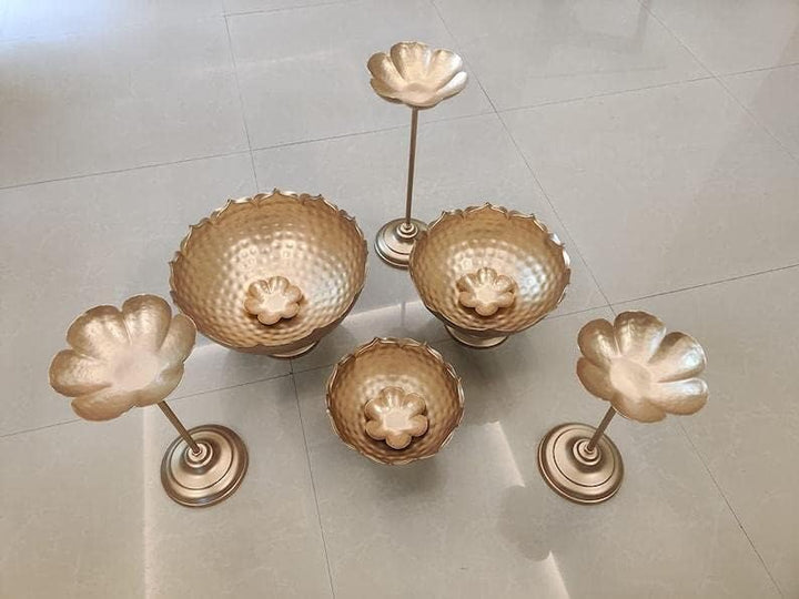 This set, crafted from iron with a luxurious royal golden finish, features bowls in sizes of 12", 10", and 8", paired with lotus-shaped tealight candle holders to elevate the ambiance of any room.