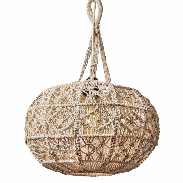 The off-white tone and textured handmade finish exude a laid-back bohemian vibe. Its round shape softens the space, while the gentle fall of macramé strands adds movement and depth—perfect for those who seek earthy tones and artisanal detailing.