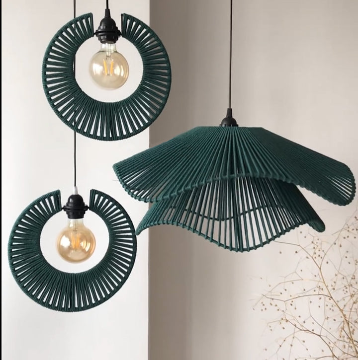 Discover the captivating charm of our Trenly Deep Green Handwoven Cotton Pendant Lamps. Each piece is a testament to skilled craftsmanship, meticulously woven from ethically sourced cotton to bring a unique, organic texture to your space. The trio features two elegant circular open-ring designs and one beautifully layered dome pendant, casting a soft, ambient glow that transforms any room into a haven of style and serenity.