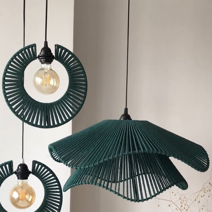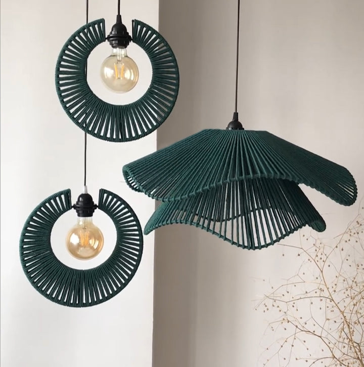 Immerse your home in an atmosphere of calm and inviting sophistication. The deep green tone of these pendant lamps, paired with the soft diffusion of light through the cotton weave, contributes to a truly tranquil environment. Perfect for creating a focal point or adding a subtle accent, this set offers a unique way to infuse your personal sanctuary with hand-crafted luxury and a touch of nature-inspired elegance.