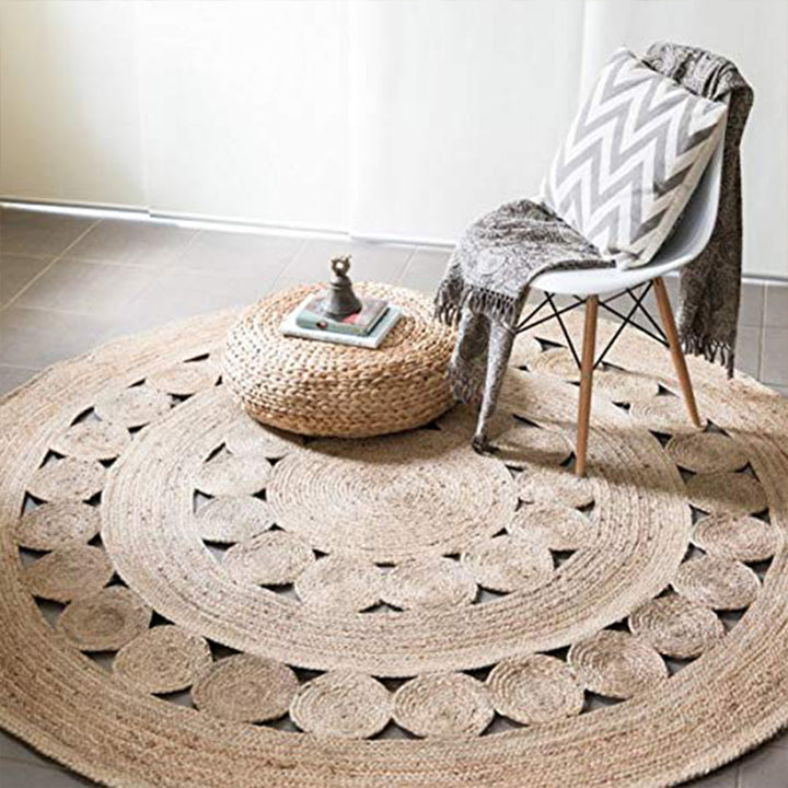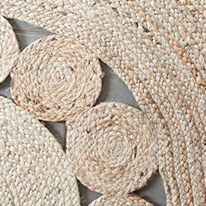 Experience the inviting allure of natural jute's soft yet durable texture. Its distinctive earthy aesthetic and rustic charm instantly infuse your space with a sense of grounded tranquility. The circular shape and intricate weave create a welcoming focal point, adding depth and organic warmth to any room.
